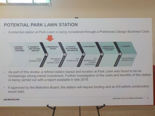 Long Branch and Mimico stations are two of the last stations that GO Transit has that are not accessible stations.  The proposal for Park Lawn is still early in its design process.
